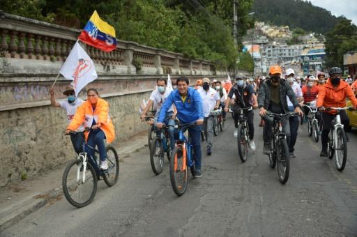 O candidato à Presidência do Equador, Andrés Arauz, afilhado político do ex-presidente socialista Rafael Correa, anda de bicicleta durante ato de campanha em Quito, 26 de janeiro de 2021 afp_tickers