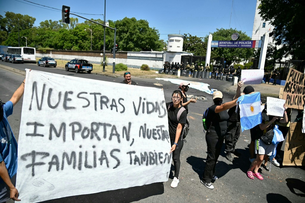 Cerca de 200 pessoas, incluindo oficiais aposentados e familiares, manifestaram-se queimando pneus em frente à chefia de polícia da cidade, a mais atingida pelo crime na Argentina, enquanto viaturas e motos soavam suas sirenes a poucos metros.