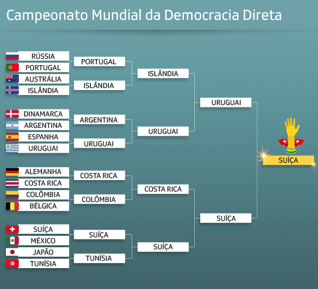 As 32 seleçõesLink externo se qualificaram com diferentes desempenhos, hoje levados em conta em um campeonato mundial da democracia direta. Esse torneio é decidido através de eleições livres e justas, respeito do Estado de Direito e formas abrangentes da democracia direta e participativa.