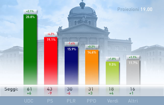 Segundo a primeira projeção nacional, que inclui resultados definitivos de 15 dos 26 cantões, a União Democrática do Centro (UDC, direita nacionalista) seria o grande vencedor dessas eleições, com cerca de 28,8% dos votos (26,7% em 2003). Se esses resultados se confirmam, a UDC passaria de 55 a 61 cadeiras na Câmara dos Deputados.