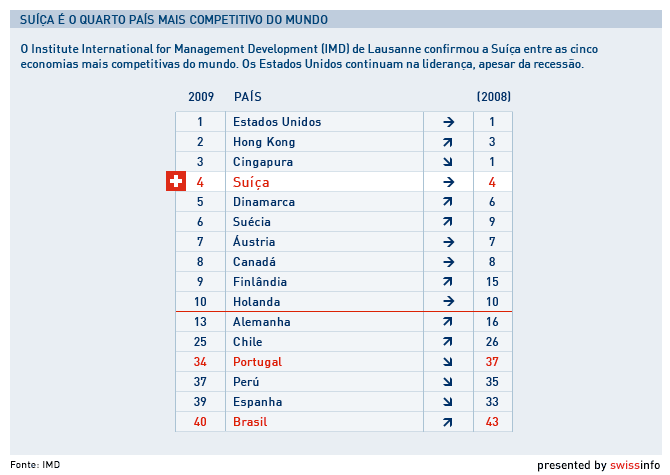 O relatório 2009 sobre Competitividade Mundial, elaborado pelo Instituto suíço IMD, mantém a economia helvética na mesma posição do ano passado, ou seja, em quarto lugar.