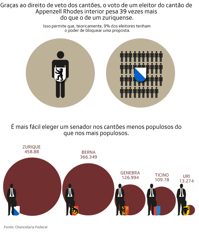 Exagerando um pouco, poderíamos dizer que a questão é se queremos uma ditadura da maioria ou uma ditadura da minoria. De acordo com o princípio “um cidadão, um voto”, os cantões mais populosos como Zurique, Berna, Vaud e Argóvia poderiam derrotar sistematicamente nas votações os pequenos cantões como Glarus, Jura, Schaffhausen ou Uri. Da mesma forma, a Suíça de língua alemã poderia facilmente dominar as decisões do país, em detrimento da Suíça de língua francesa e italiana, já que 70% da população é de língua alemã.