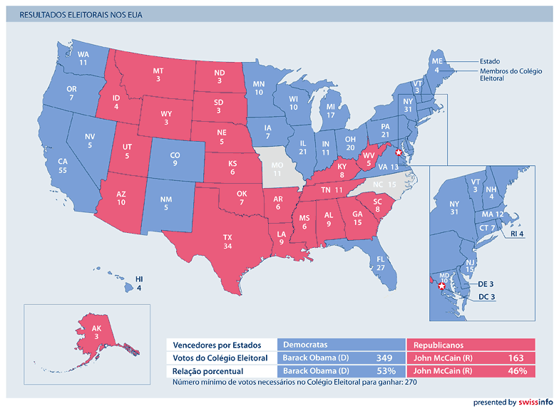 Barack Obama venceu as eleições presidenciais de 2008, tornando-se no 44º Presidente dos Estados Unidos da América, ao conquistar mais de 330 votos eleitorais, ou seja, mais do dobro das representações conseguidas pelo seu adversário republicano no colégio eleitoral.