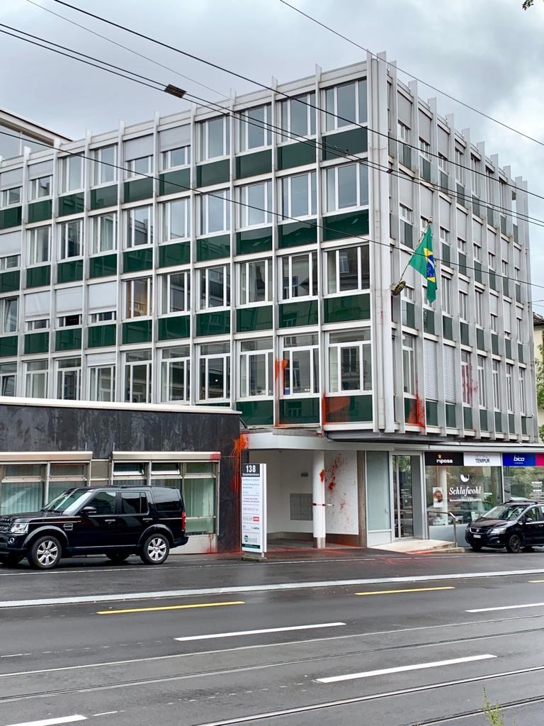 O consulado geral do Brasil em Zurique amanheceu vandalizado nesta segunda-feira, véspera da abertura da Assembleia Geral da ONU em Nova York. A entrada do edifício estava cheia de marcas de tinta vermelha e cacos de vidro, supostamente das garrafas jogadas contra a fachada do prédio.