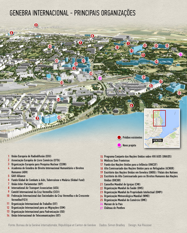 Genebra abriga a sede de várias organizações internacionais. Ao todo, cerca de 42 mil diplomatas e funcionários públicos internacionais estão baseados na cidade e há cerca de 2400 colaboradores trabalhando para 250 organizações não-governamentais.