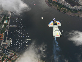 Em junho do ano passado, ele bateu o recorde mundial de distância em vôo de “wingsuit” – roupa especial que permite planar em queda livre – ao cobrir 17,6kms sobe a Baía de Galway, na Irlanda.