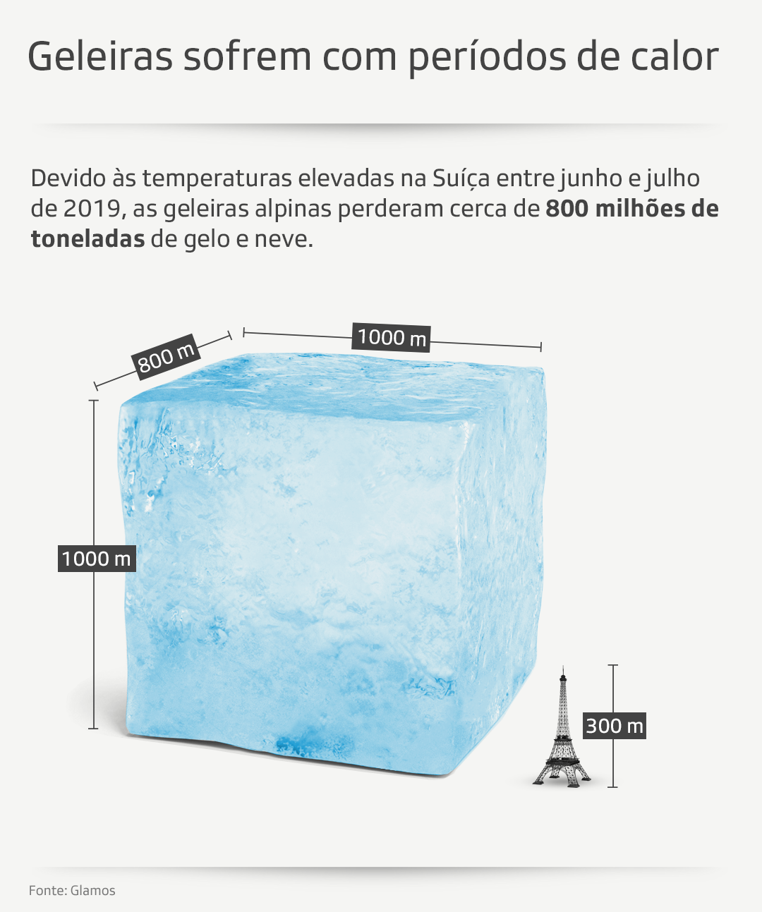 A perda equivale a um “cubo de gelo” três vezes mais alto do que a Torre Eiffel, em Paris. Ou a quantidade de água potável consumida pela população suíça (8,5 milhões de pessoas) por ano, explicou Huss.