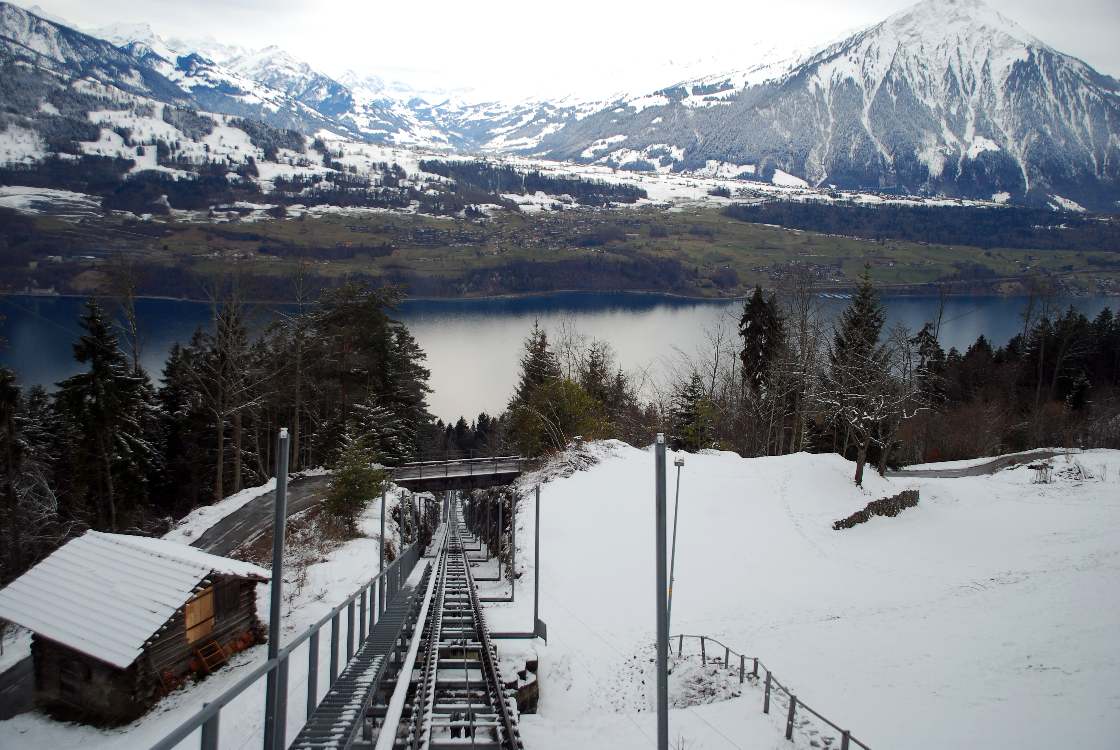 De Frutigen à Thun gasto apenas trinta minutos. O ônibus da STI, que serve toda a região, sai em apenas dois minutos. A empresa também oferece a “Moonliner”, uma linha especial em cooperação com outras empresas e cujo principal objetivo é permitir as pessoas sair à noite, beber e não precisar dirigir. Ele percorre a margem do lago de Thun e vai atravessando diversos vilarejos até chegar à estação do Niederhorn, cujo trem à cremalheira e o teleférico levam os turistas até o cume com o mesmo nome, 1.963 metros acima do nível do mar e com uma vista espetacular para os Alpes bernenses. Nela preciso comprar pela primeira vez um bilhete além do ticket diário que vale para todos os meios de transporte. O sistema na Suíça é integrado, mas tem algumas exceções com pequenas linhas privadas ou exclusivamente turísticas.