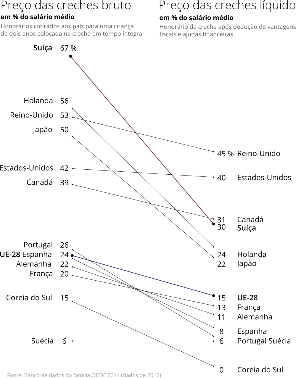 Esta questão é confirmada por estudos internacionais. Com uma conta em torno de dois terços do salário médio para uma vaga em tempo integral na creche, a Suíça fica disparada na frente dos países da OCDE em termos de custos para o acolho de crianças fora da família.