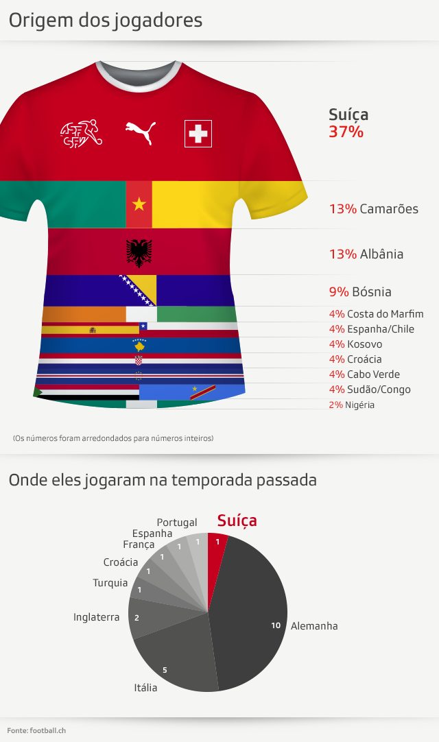 Como nas copas anteriores, muitos dos jogadores têm antecedentes de imigração (ver gráfico). Dos 12 meio-campistas e atacantes selecionados, dez nasceram no exterior ou têm pais que imigraram para a Suíça.