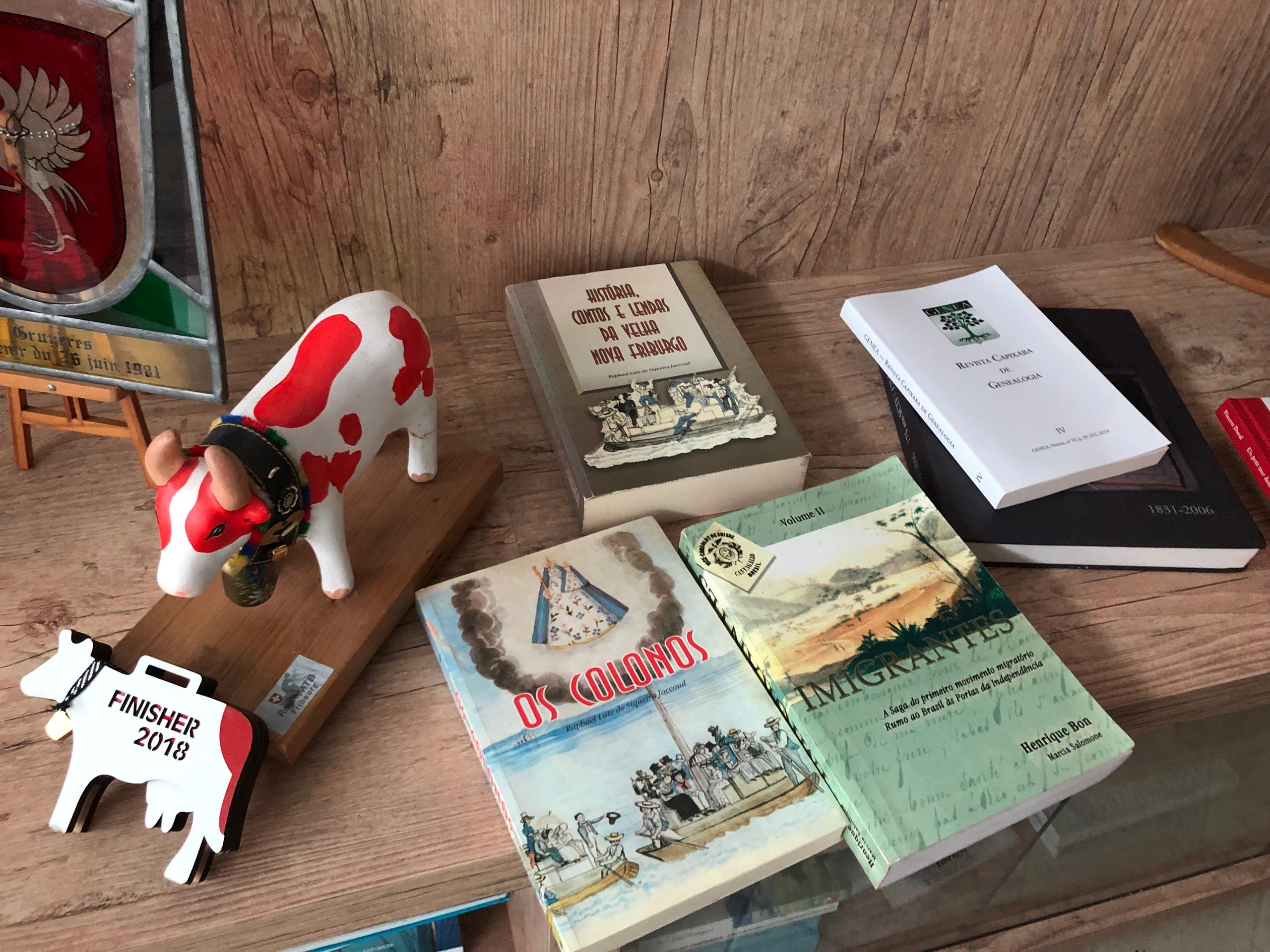 Geraldo Thurler abre com cuidado a porta de vidro da pequena sala. Esse aposentado preside a Colônia Suíça de Nova Friburgo e está muito orgulhoso do que apresenta aos visitantes. A Praça das Colônias foi reinaugurada em 2018, sete anos depois que uma enchente destruiu parte de suas estruturas. Na sala, que ele próprio ajudou a decorar, tem no fundo uma decoração que lembra um típico chalé alpino, com janelas e vasos de flores. Um grande poster pendurado na parede lateral exibe uma paisagem alpina, com montanhas cobertas de neve e um lago. Na mesinha à esquerda, diversos objetos estão expostos: livros com fotografias da Suíça, o brasão da região do Gruyère e estudos sobre a migração helvética como “Imigrantes”, do estudioso local Henrique Bon (ver entrevista).