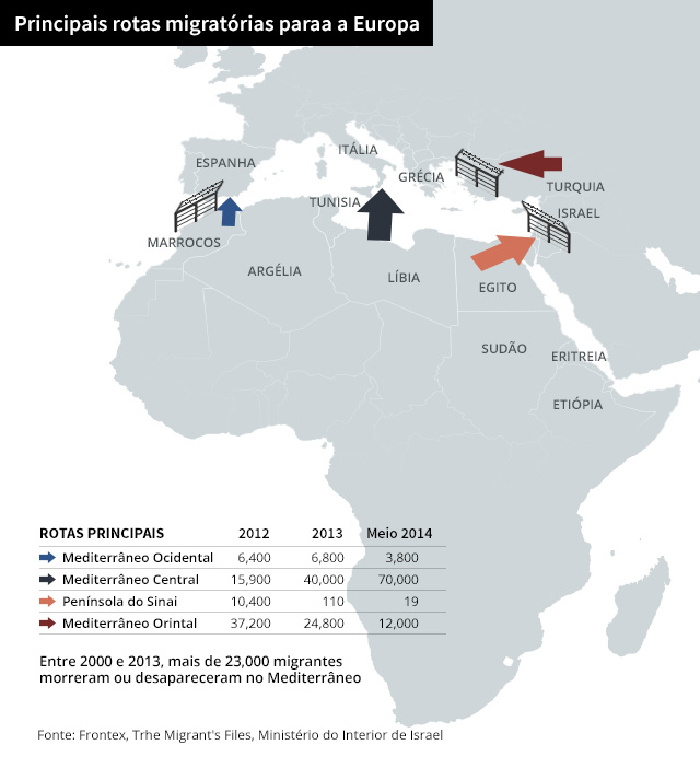 Desde quando Israel construiu um muro de 230 Km na fronteira com o Egito, tornando praticamente vedada a fronteira, a rota do Mediterrâneo é a mais utilizada pelos migrantes eritreus. O número de desembarques na costa italiana aumento muito, apesar do caos que reina da Líbia e a operação Mare Nostrum lançada em 2013 pela Itália para socorrer migrantes no mar.