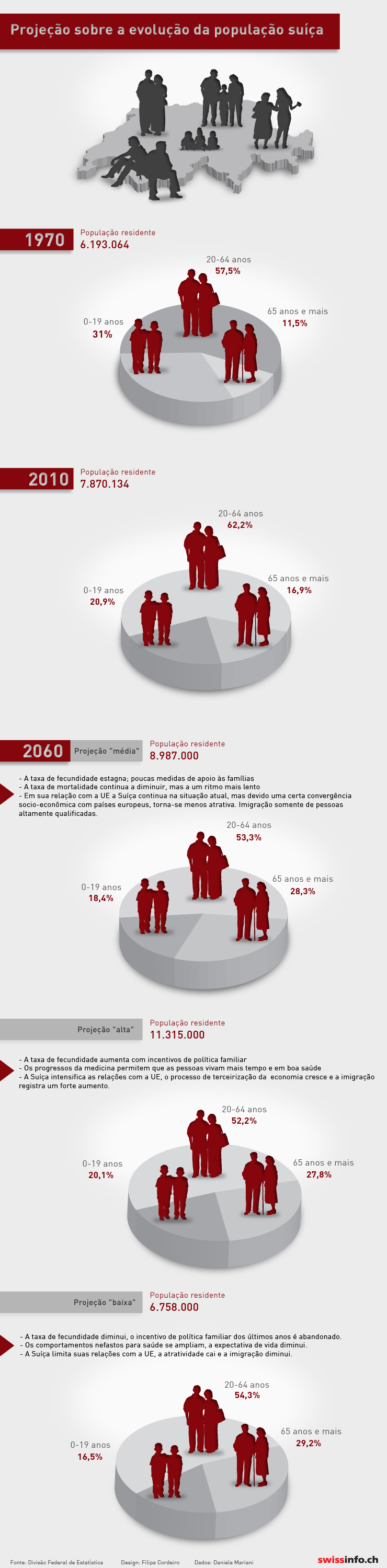 Atualmente um em cinco pessoas na Suíça tem mais de 65 anos. Em 2060 essa proporção passará de um para quatro. Ao mesmo tempo, a parte de jovens se reduz pela metade, como indicam as projeções do Departamento Federal de Estatísticas.