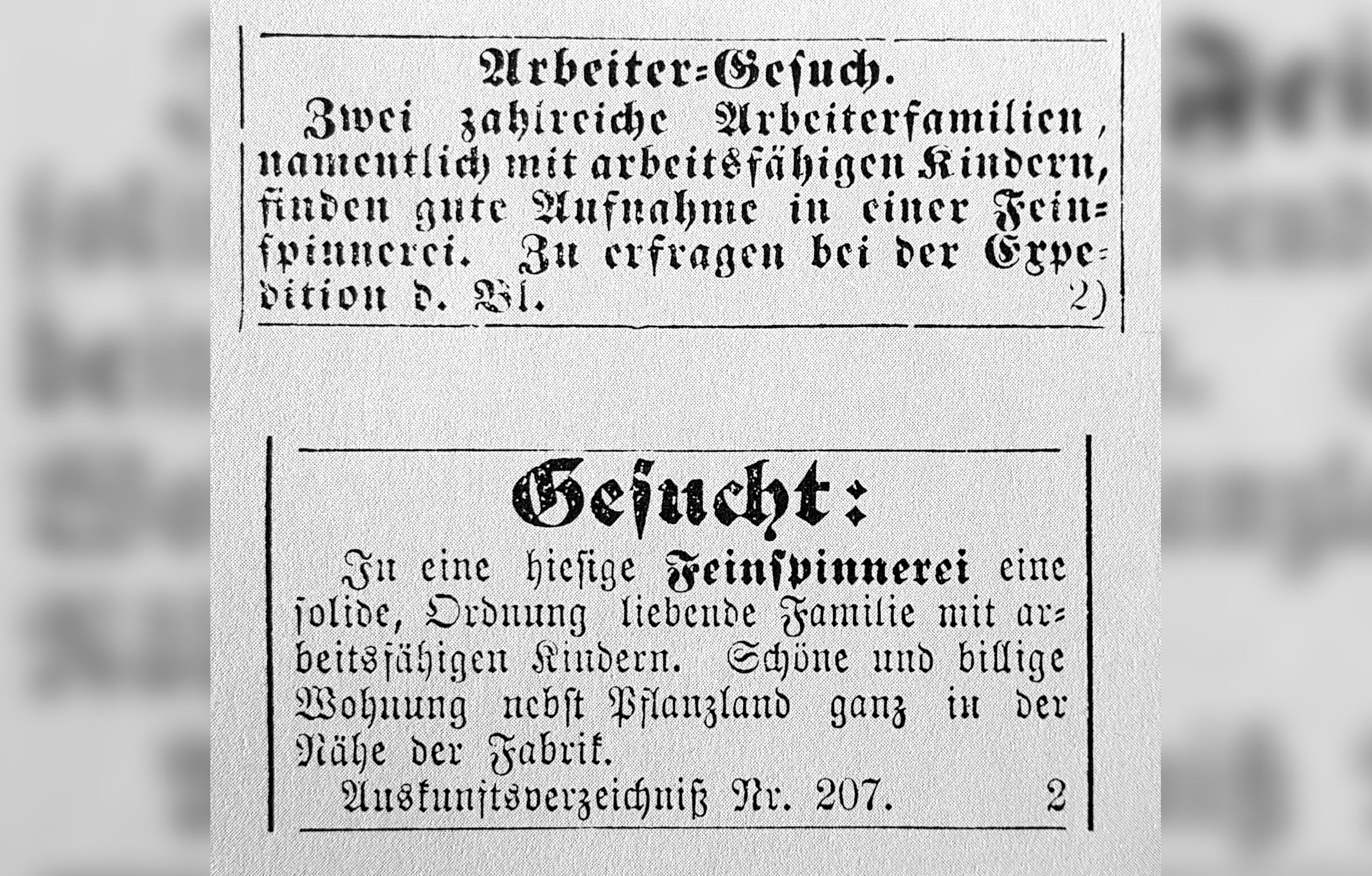 Com este anúncio no jornal “Anzeiger von Uster”, um industrial suíço procurava funcionários na década de 1870. Era evidente que as crianças das famílias operárias tinham que contribuir com a sua força de trabalho. O trabalho infantil não começou com a industrialização, mas deixou de ser algo do cotidiano para se tornar uma verdadeira exploração de mão-de-obra barata.