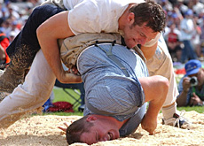 Dois jovens colossos entram na arena livre coberta de serragem em um vilarejo no interior da Suíça. Sem provocações desnecessárias, eles apertam as mãos e imediatamente se abraçam. As mãos seguram com firmeza no forte cinto de couro que segura o calção de juta do oponente. Depois que o juiz dá o sinal, a musculatura se retesa e um tenta jogar o outro ao chão. Os golpes são orquestrados com estratégia, como no judô. Um dos lutadores vacila, perde o equilíbrio e cai de costas. Rapidamente se curva para não encostar no chão. O outro joga todo o seu peso, mais de cem quilos, em cima do rival. Este toca finalmente a serragem e o juiz indica a derrota. O vencedor ajuda o colega a se levantar e limpa a sujeira pregada na sua camisa. Mais uma das tradições centenárias do Schwingen, a luta suíça.