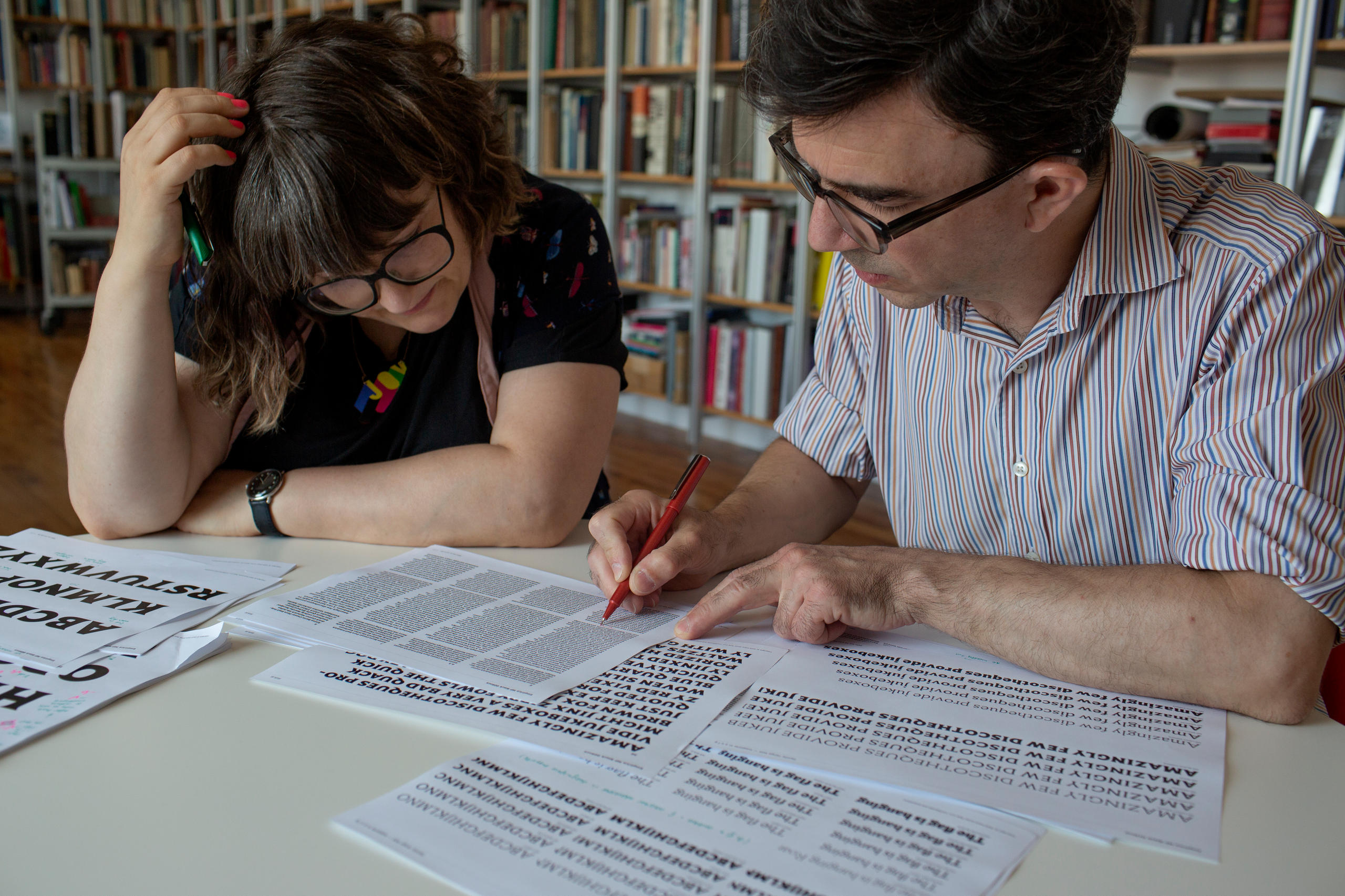 Depende de em que fase da criação de uma nova fonte nós estamos. No momento, estou esboçando algumas tipografias novas e isso significa que passo o tempo desenhando. Quando se desenha uma fonte, é basicamente um vai e vem entre desenhar as letras individualmente e testá-las – imprimi-las para ver como ficam num contexto e ver se realmente funcionam. A outra parte do meu trabalho é mais técnica, e consiste em produzir as fontes em diferentes formatos para que nossos clientes as utilizem.