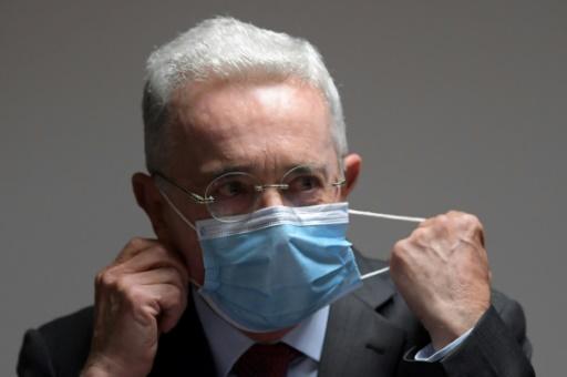 O ex-presidente colombiano Álvaro Uribe tira a máscara para falar durante reunião do partido Centro Democrático após as eleições legislativas em Bogotá, em 15 de março de 2022 afp_tickers