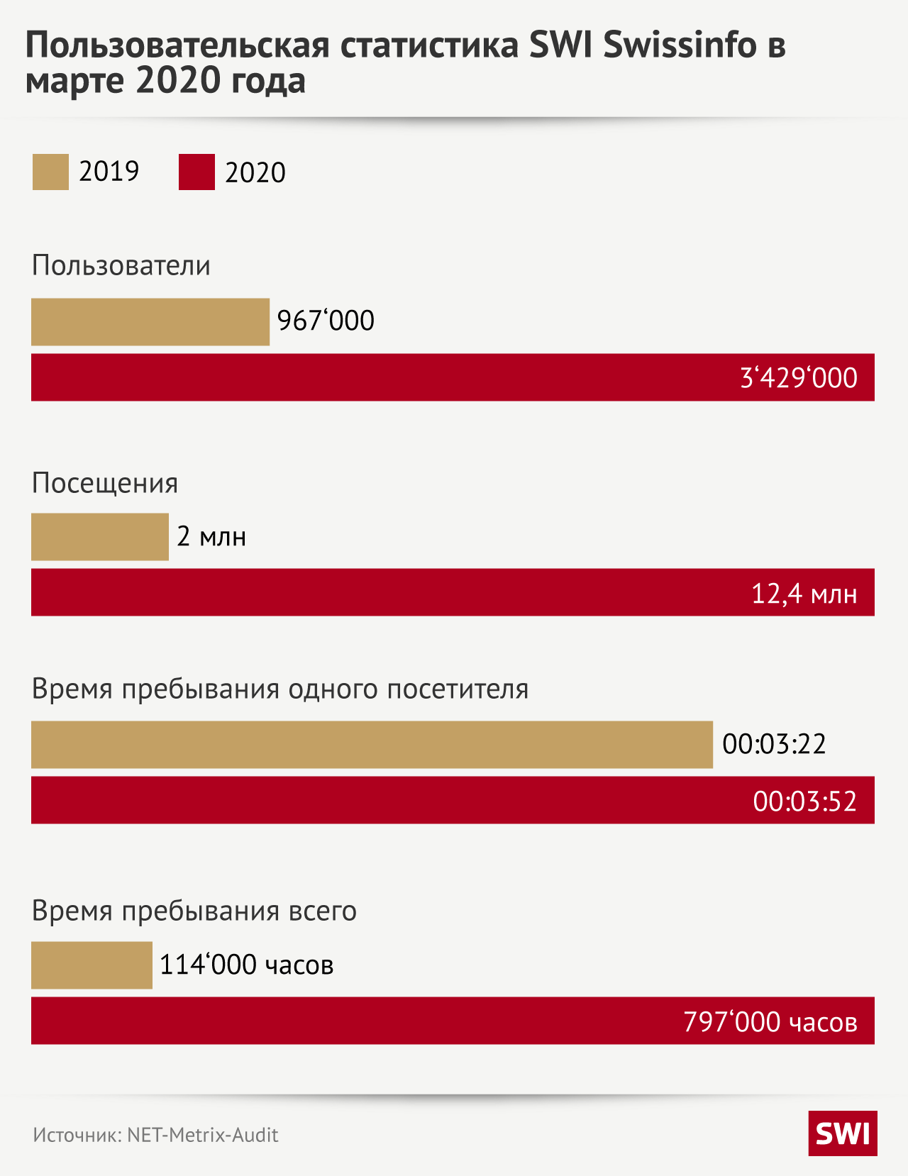 Но для начала — наши статистические данные. Спрос на проверенную, разностороннюю, взвешенную, трезвую, спокойную и глубокую информацию находится в эти дни на небывало высоком уровне. Касается это напрямую и швейцарского иновещания. Наши публикации на всех десяти языках в марте 2020 года побили все мыслимые рекорды. Число уникальных посетителей, пришедших на страницы нашего сайта SWI swissinfo.ch, публикующих информацию на десяти языках (трёх официальных швейцарских (нем., фр., ит.), английском, а также русском, португальском, испанском, японском, китайском и арабском), выросло по сравнению с мартом 2019 года в три раза, а среднее время пребывания на одном материале — в целых семь раз. Таковы официальные данные независимой медиаметрической швейцарской организации NetmetrixВнешняя ссылка.