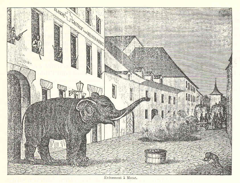 Три часа утра 28 июня. Иоганн Фрей (Johann Frey), местный кузнец, еще спит. Его будят необычные звуки, доносящиеся с улицы. «Посмотрел за окно, а там всем городом слона ловят», — запишет он потом в своем дневнике. А произошло вот что: ночью после представления один из двух слонов (самец) сорвался с привязи, убил служителя слоновника, вырвался на свободу и начал метаться по улицам города.