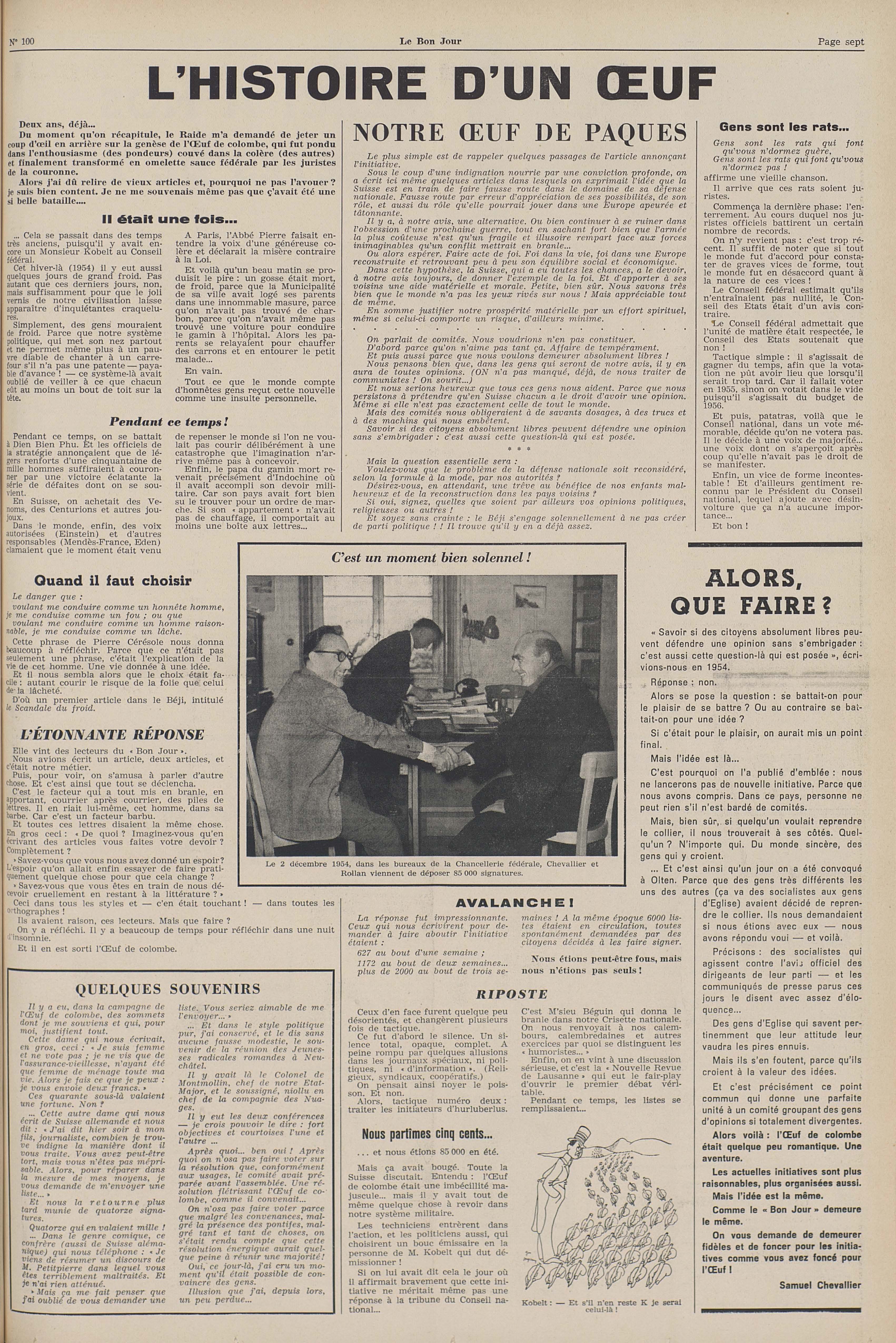 Лозанна, Пасха,14 апреля 1954 года: на страницах сатирической газеты Джека Роллана* Le Bon Jour писатель, журналист и радиоведущий Самюэль Шевалье (Samuel Chevallier, 1906–1969) выступает с народной законодательной инициативой**, предлагающей реализовать идею сокращения военных ассигнований вдвое. Сэкономленные средства можно было бы, по его мнению, направить на социальные нужды и на послевоенное восстановление Европы. Переданная, как и положено, в Федеральную канцелярию с более чем полуторакратным превышением необходимого количества поставленных под ней подписей, в декабре 1955 года эта инициатива была признана парламентом не соответствующей законодательству, так что ее текст так никогда и не был вынесен на всенародное голосование. Однако история на этом не закончилась. Инициативный комитет, объединивший всех ведущих пацифистов страны, выдвинул две новые инициативы, каждая из которых ставила в центр одну из идей, находившихся в тексте «инициативы Шевалье». Но не повезло и им тоже: почти сразу после официального запуска этих инициатив произошло вторжение войск СССР в Венгрию, так что на этом фоне инициаторам не оставалось ничего иного, кроме как отозвать и эти законопроекты.