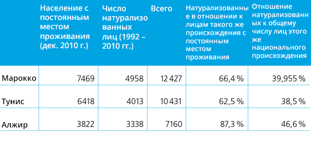 Доля марокканцев, прибывших в 2002 году в Швейцарию с целью получить образование, не превышает 20%. В последние годы серьезно выросло число натурализаций. В период между 1992 и 2010 гг. каждый год паспорта Швейцарии получали от 200 до 280 тунисцев, а также примерно 150-200 алжирцев. Для более подробной информации см. нижеследующую таблицу.