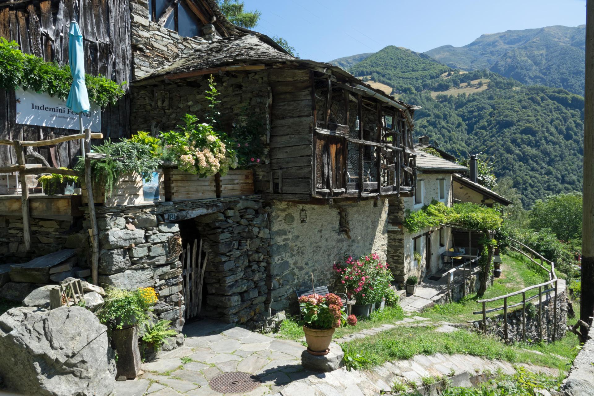 Регион Индемини знаменит своими каменными домами, так называемыми «рустичиВнешняя ссылка» (rustici, ед. ч.: rustico). В Монти Шиага таких домой много — их тут до сих пор строят по дедовским рецептам с применением естественных строительных материалов, добытых тут же, на месте. Если посмотреть на него со стороны, то хутор этот, или деревня (называть это поселение можно по-разному) вовсе не производит заброшенного впечатления. Однако стоит перейти через ручей Джиона и добраться до центра деревни, как сразу можно увидеть, что многие дома тут покинуты, крыши у них провалились и порой стоять остались только стены. Их-то как раз, видимо, строили на совесть.