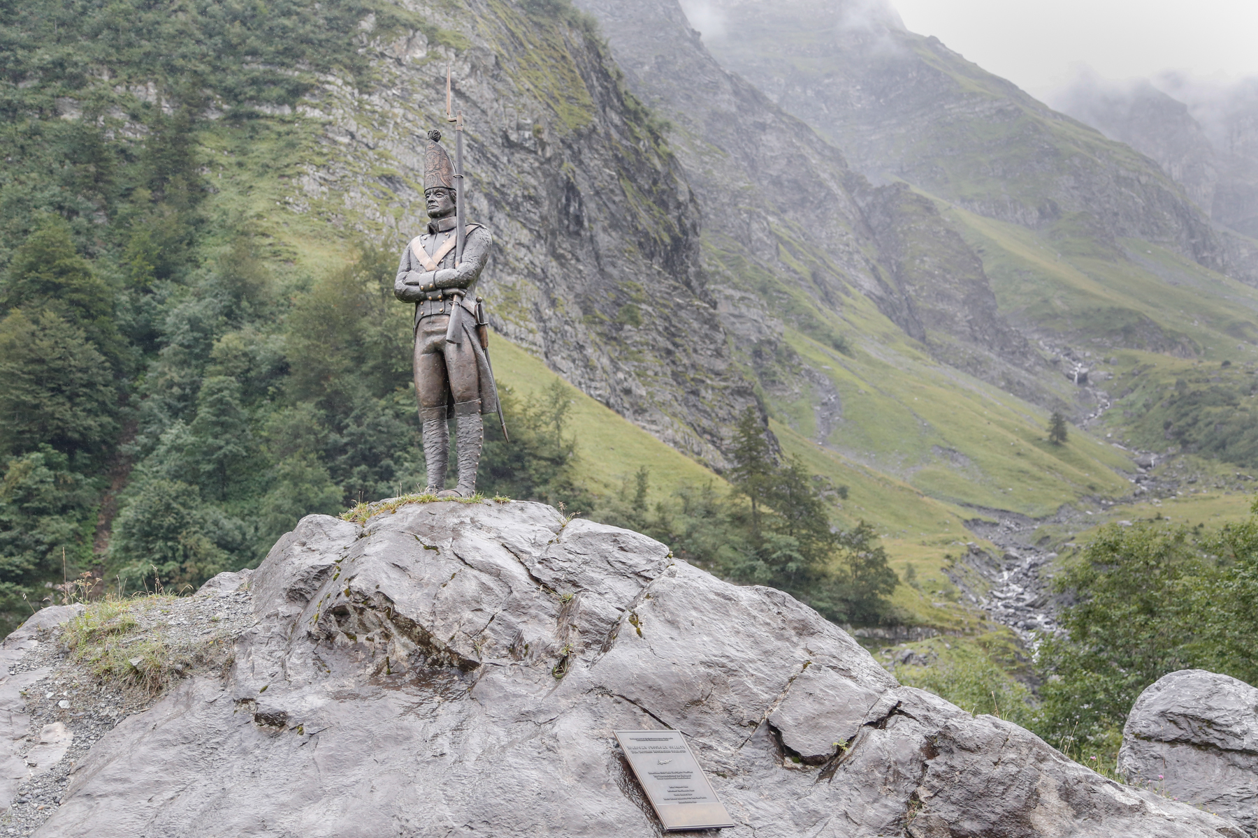 В Гларусе, также, как и в Андерматте и Альтдорфе, Суворов ночевал в одном из домов, который теперь находится в личной собственности Каспара. Но сначала тот показывает место, где начался последний, самый сложный, участок маршрута суворовской армии, из Гларуса через перевал Паникс в сторону города Кур. Сегодня здесь расположен, что довольно логично, танковый полигон швейцарских Вооруженных сил. На краю парковки, рядом со списанным танком, вокруг которого мирно пасутся козы, установлен очень простой памятник суворовскому солдату, в военной форме образца конца 18-го века, с винтовкой с примкнутым штыком. Он стоит спиной к горам и лицом к долине, словно защищая ушедших вперед своих товарищей по оружию.