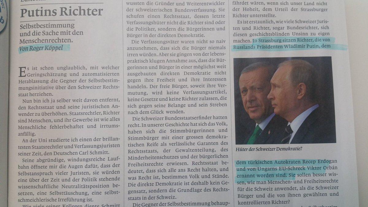 Аргументацию сторонников этой инициативы очень хорошо выразил главный редактор правоконсервативного швейцарского журнала «Вельтвохе» Роджер Кёппель. В недавней редакционной колонке он указал, что «судьи в ЕСПЧ назначаются такими людьми, как президент Путин, автократ Эрдоган и европейское пугало Орбан. И вот они должны лучше нас знать, как обстоят дела в Швейцарии с правами человека, лучше, чем даже судьи, избранные и контролируемые самими швейцарскими гражданами»?