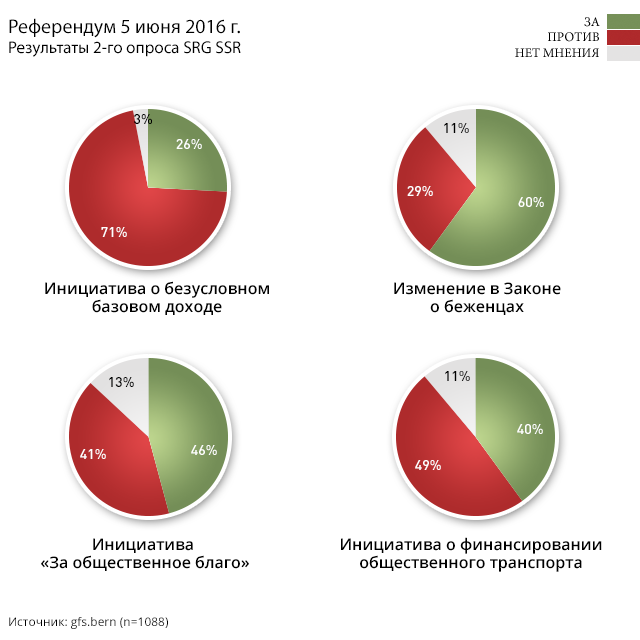 Совершенно ясным представляется исход голосования по инициативе о безусловном базовом доходе — идея, наделавшая много шуму даже за пределами Швейцарии. Эксперты говорят о том, что у инициативы «нет никаких шансов». Хотя и «полностью вопреки ожиданиям» число сторонников этой идеи выросло на 2 процента и составило на данный момент 26%. Лагерь противников инициативы потерял один процент, но все еще насчитывает 71% голосов. Политологи из gfs.berne считают, что мнение по данному вопросу было сформировано у электората достаточно давно. Об этом говорит низкий процент неопределившихся — в середине апреля только 4% избирателей не знали, как будут голосовать, сейчас — лишь 3%.