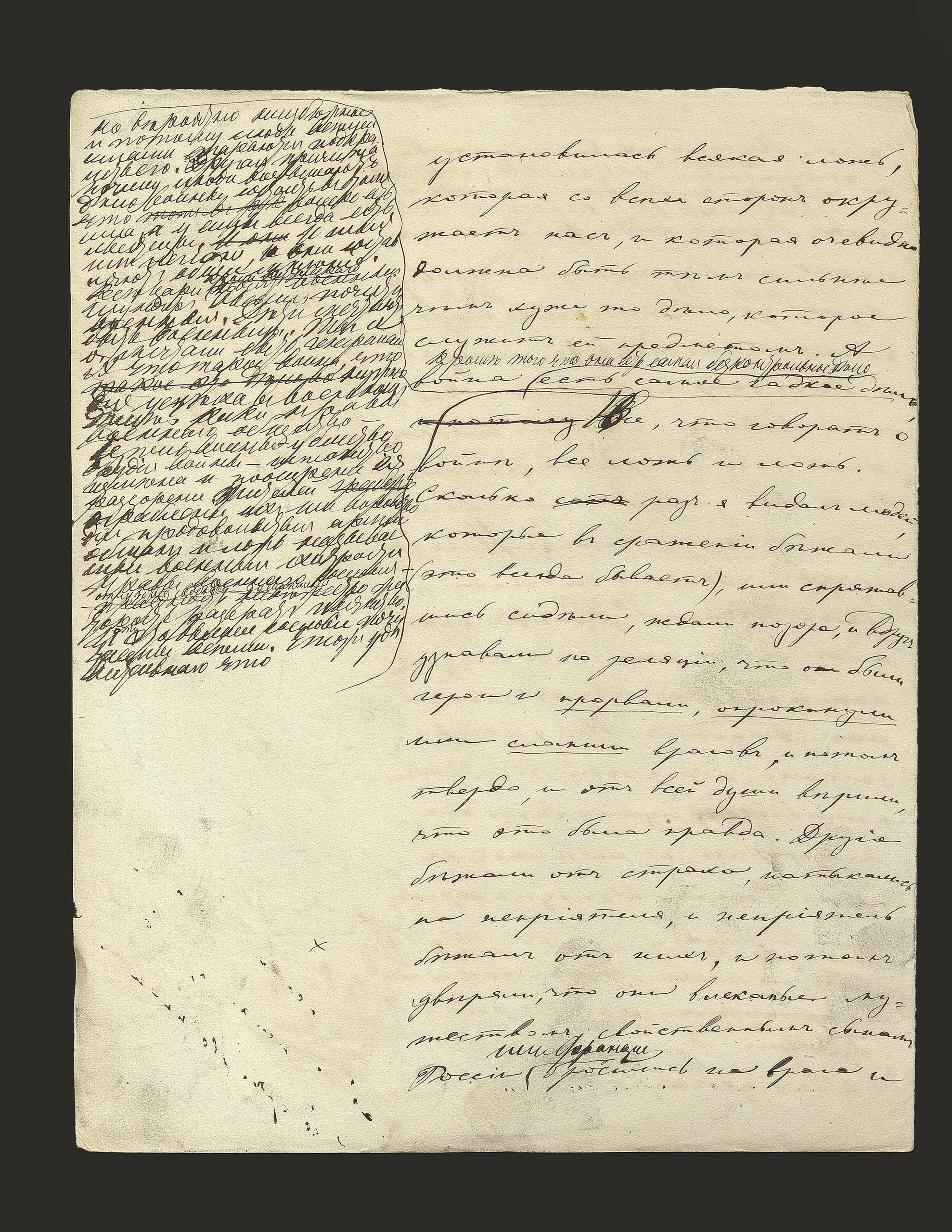 По случаю этой экспозиции в Женеву впервые были привезены из Москвы и показаны оригинальные страницы рукописи этой книги. И недаром Пьер Хазан вспоминает знаменитый диалог из романа, когда перед Бородинским сражением князь Андрей Болконский говорит Пьеру об античеловеческой сущности войны.
