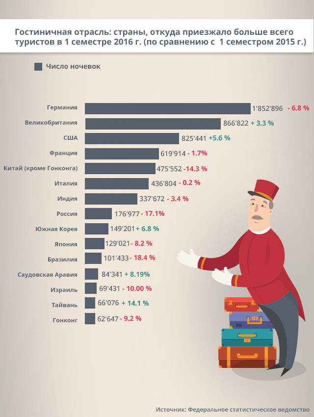 Плохая новость состоит в значительном уменьшении числа туристов, традиционно любящих ездить в Швейцарию. Речь идет, прежде всего, о гостях из Германии, число ночевок которых сократилось на 136 тыс. (-6,49%). Меньше стало и выходцев из стран бывшего блока БРИКС. Количество ночевок китайских граждан (без Гонконга), например, снизилось на 80 тыс. (-14,3%). Россиян в Швейцарии за последнее время также поубавилось, примерно на 17%.