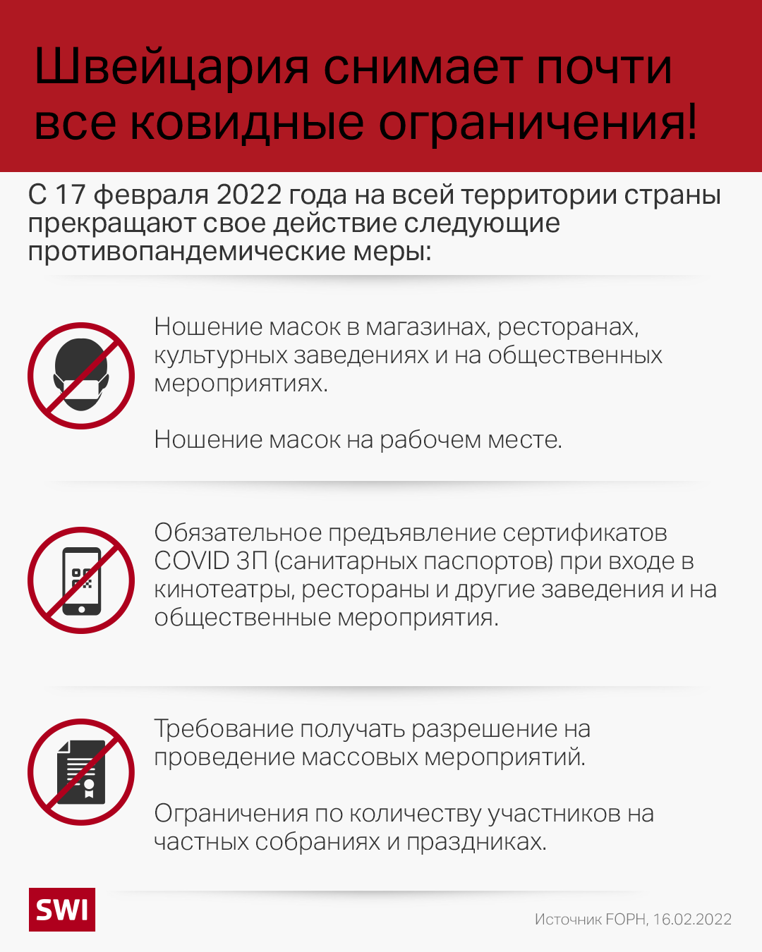 Правительство Швейцарии ввело жесткие ковидные ограничения в октябре 2021 года после резкого всплеска числа новых случаев заражения вариантом вируса Omicron, но с тех пор оно поэтапно ослабляло их. Режим карантина и обязательная «удаленка» были отменены 3 февраля 2022 года. В конце января также были либерализированы карантинно-тестовые требования для людей, въезжающих в Швейцарию. С четверга 17 февраля эти меры будут свернуты окончательно, то есть теперь при въезде в Швейцарию не нужно будет предоставлять доказательств вакцинации и выздоровления, а также отрицательных тестов на ковид. Заполнять электронную въездную форму, как сообщило правительство, также теперь не нужно.