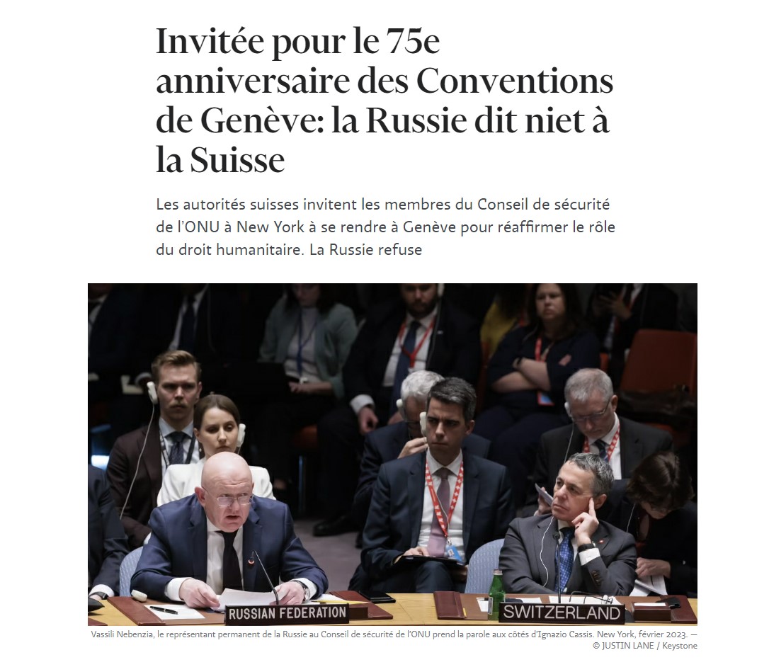 Как пишет швейцарская франкоязычная газета Le Temps, по случаю 75-й годовщины Женевских конвенций все страны-члены Совета Безопасности ООН были приглашены в Женеву, с тем чтобы отметить эту важную дату. Приняли приглашение все страны — кроме России. Посол России при ООН Василий Небензя не назвал никаких причин такого решения. Однако можно предполагать, что Москва отказалась посетить Женеву по причине того, что Швейцария была официально отнесена Москвой к категории «недружественных стран». Произошло это после присоединения Берна к санкциям ЕС, введенным в марте 2022 года в отношении России.
