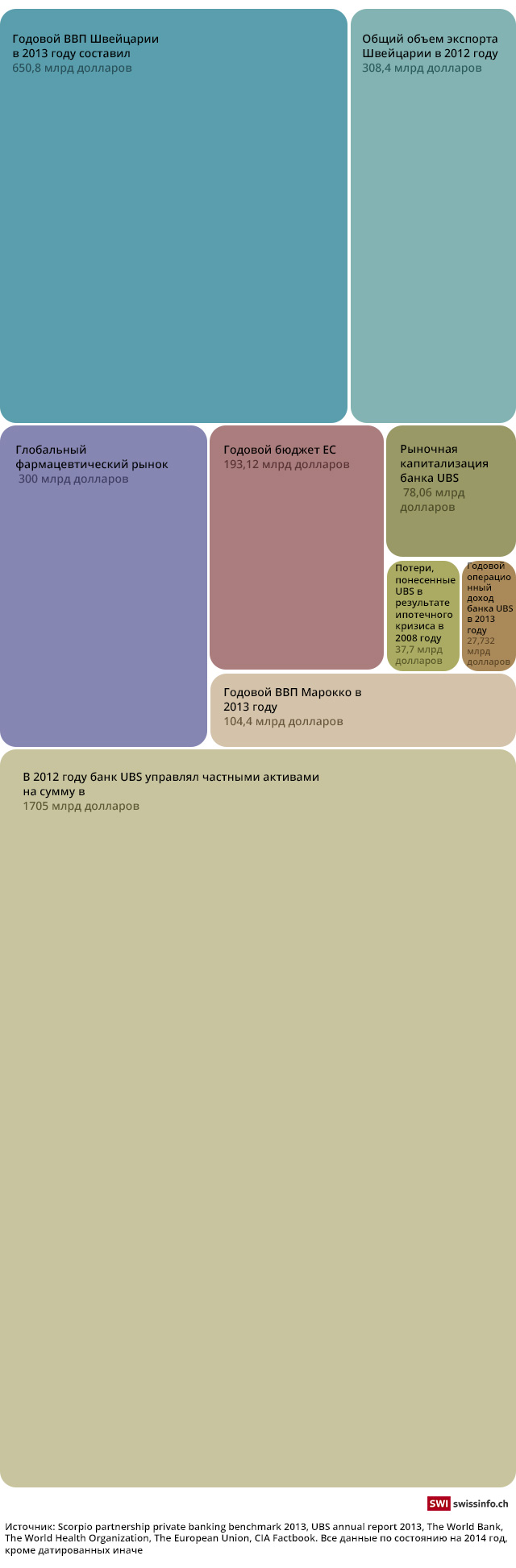 Иными словами, банк UBS и его дочерние компании управляет активами, объем которых 20-кратно превосходит рыночную капитализацию самого этого банка и трехкратно — годовой ВВП всей Швейцарии.