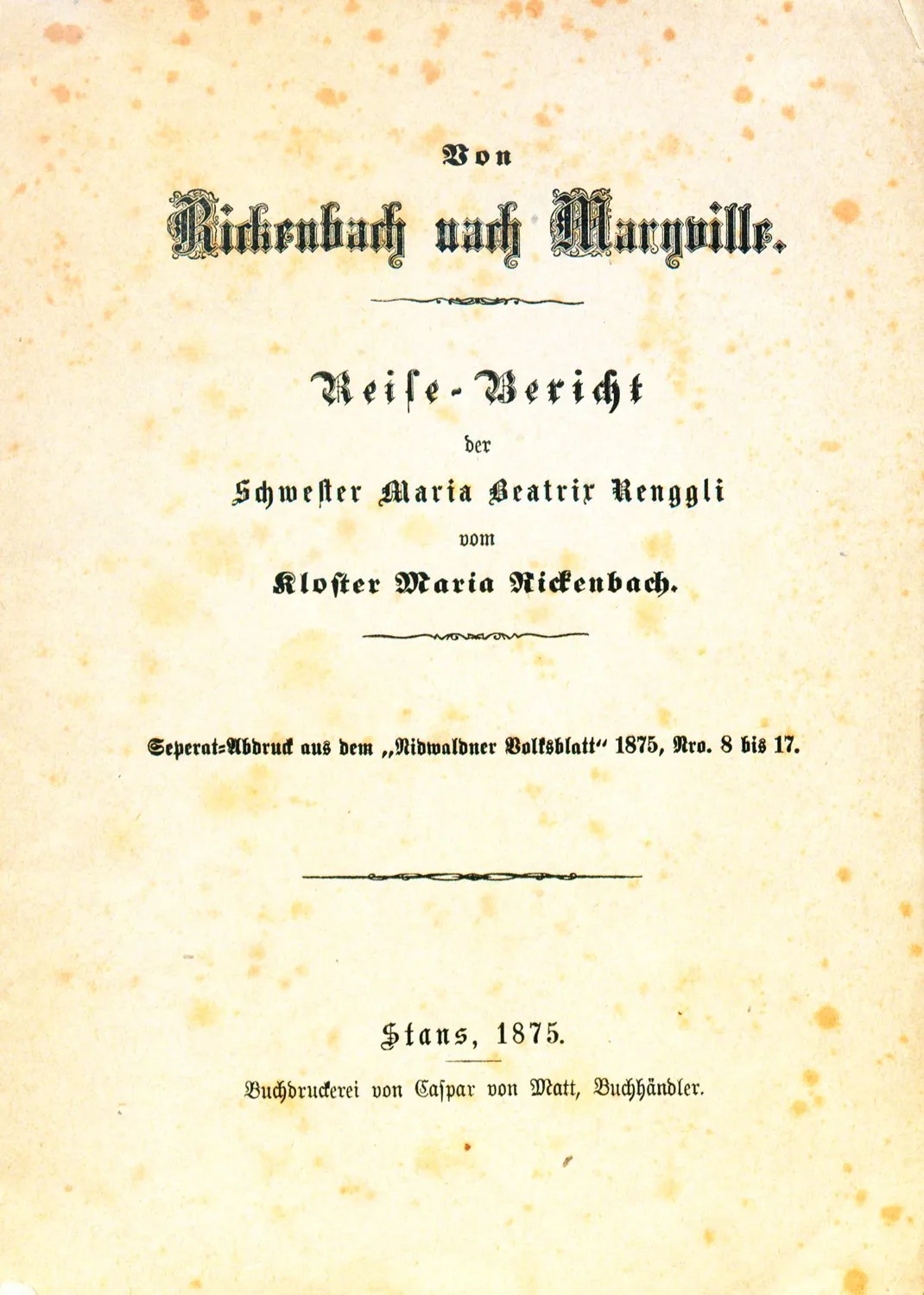 В августе 1874 года пять монахинь покинули бенедиктинский монастырь Мария-Рикенбах (кантон Нидвальден) и эмигрировали на Средний Запад Соединённых Штатов. Сестра Мария Беатрикс Ренгли (Maria Beatrix Renggli, 1848–1942) оставила подробный отчёт о своём пути в Америку.