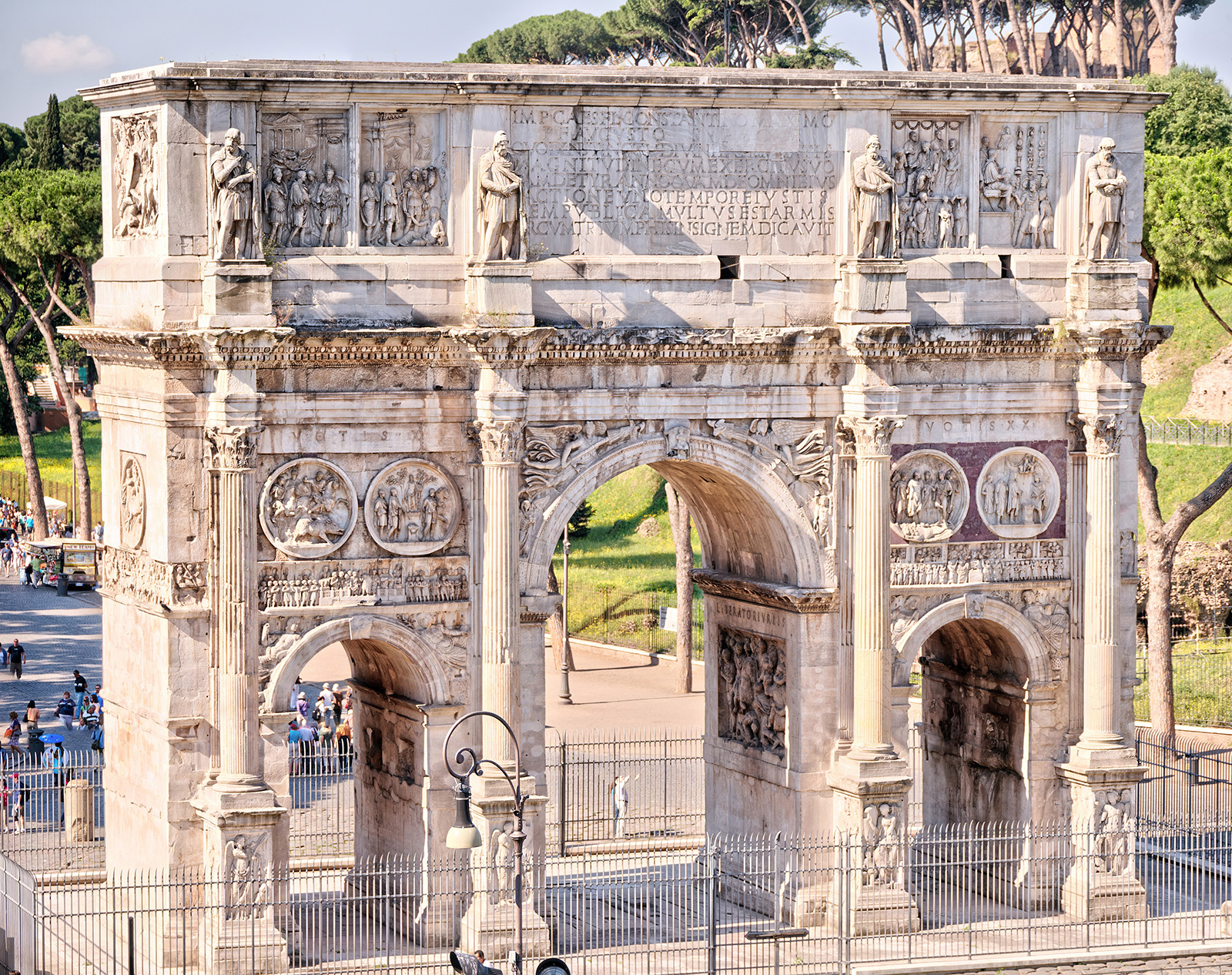 Арка Константина в Риме. Древнее сооружение, смонтированное в том числе и из еще более старых строительных компонентов. Арка была возведена в 315 году н. э. по случаю десятилетнего правления императора Константина и его победы над императором Максенцием в битве при Мульвийском мосту (312 год н. э.). Всемирно-историческое значение битвы состоит в том, что она привела к легализации христианства и его превращению в государственную религию Римской империи. Wikimedia / Philippos