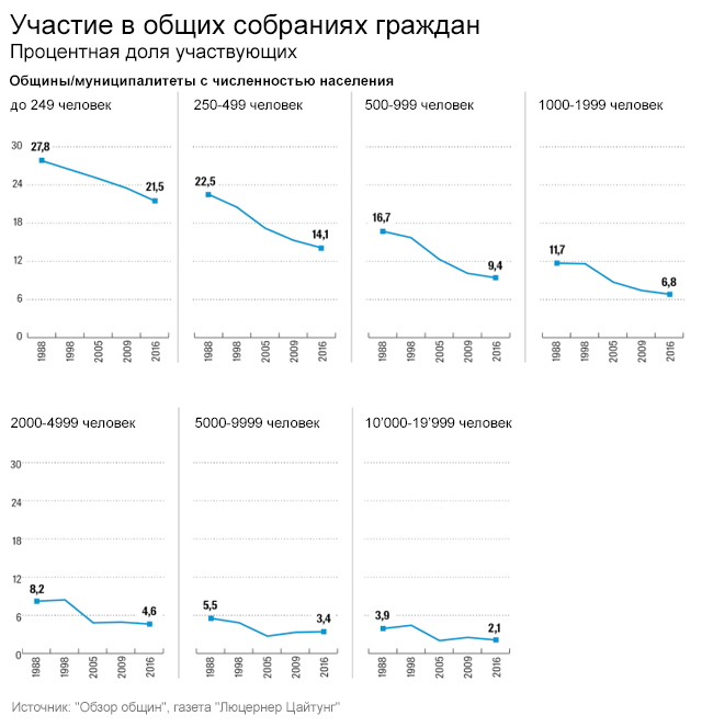 Вот еще одна собеседница, ей 37, сидит на террасе ресторана с чашкой кофе. А мотивация прежняя, мол, на собрания не хожу, не интересует меня все это ни с какой стороны». Впрочем, не будем делать из Штайнхаузена какого-то особенного случая. Как показывает приведенный ниже график, по всей Швейцарии муниципальные собрания проходят в полупустых залах, и интерес к этой форме низовой демократии в Швейцарии неуклонно падает — тенденция, наблюдаемая социологами последние 30 лет.