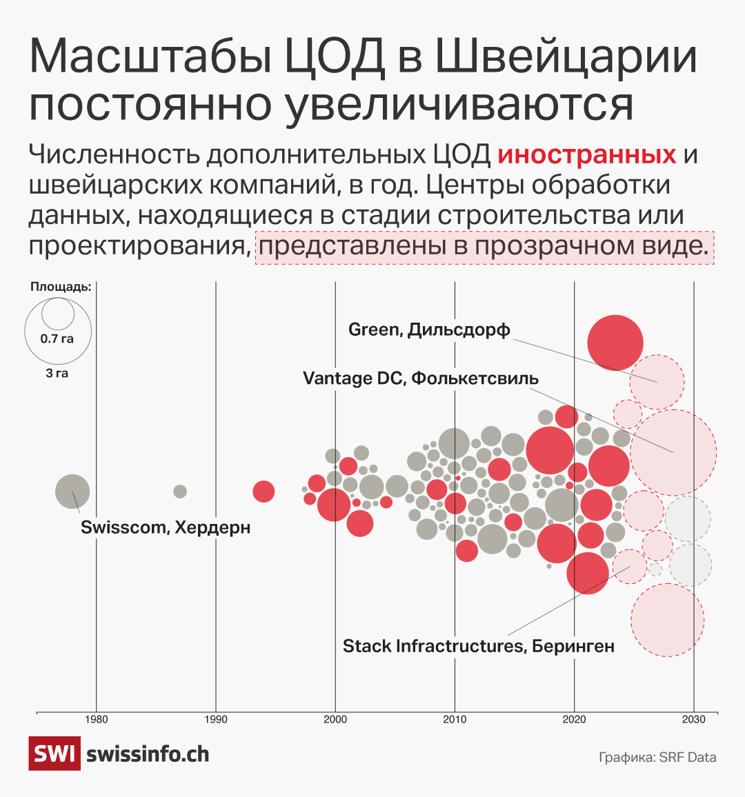 Примерно с 2017 года Швейцария активно привлекает в страну международных инвесторов со специализацией на услугах ЦОДов. Анализ редакции SRF Data показывает, что приток такого капитала заметно изменил этот рынок: ЦОДы становятся всё крупнее и технологически мощнее. Развитие такой инфраструктуры даёт стране ряд больших преимуществ, таких как совершенствование систем защиты данных и повышение качество услуг по доступу в интернет. Однако уже возникают и проблемы. Так, в 2026 году в муниципальном образовании Беринген (кантон Шаффхаузен) должен открыться один из самых мощных в Швейцарии ЦОДов. Его энергопотребление сопоставимо с 75 процентами общего потребления всего кантона Шаффхаузен в 2022 году.