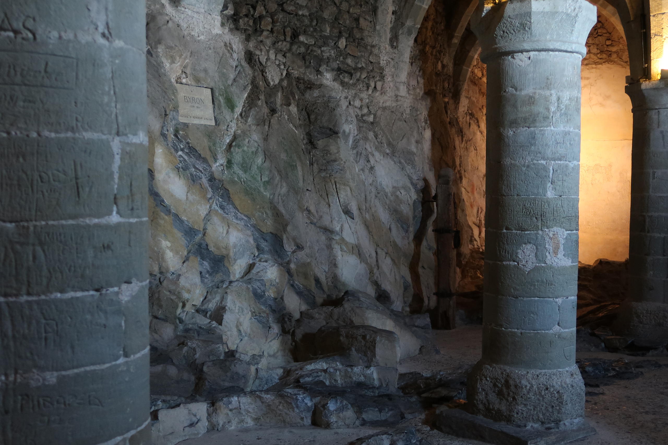 Однако если где и толпятся туристы, то именно в этом погребе. Почему же? Разумеется, потому, что именно это место и стало для лорда Байрона (1788-1824) источником вдохновения, побудившего его создать свою знаменитую романтическую поэму «Шильонский узник» (англ. The Prisoner of Chillon, 1816). А два персонажа, представленные на табличке, — это сам английский писатель и Франсуа Бонивар (1493-1570), заключенный, чья история легла в основу сюжета поэмы. На русский язык поэма была переведена В. А. ЖуковскимВнешняя ссылка в сентябре 1821 — начале апреля 1822 гг.