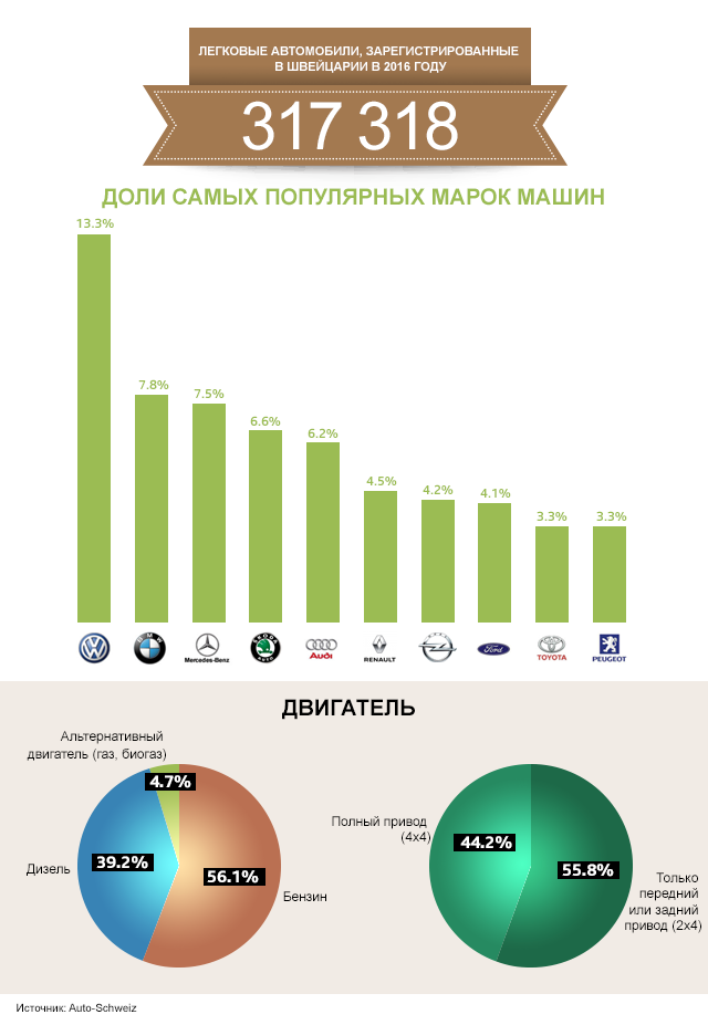 Самыми продаваемыми марками в этих двух странах в 2016 году были немецкие бренды Volkswagen, BMW, Mercedes-Benz и Audi. Таковы данные швейцарского объединения автомобильных импортеров «Auto-Schweiz». Доля машин с альтернативными двигателями (газ, биогаз, гибрид, электропривод) составила 4,7%. Кстати, а выпускала ли Швейцария свои собственные автомашины?
