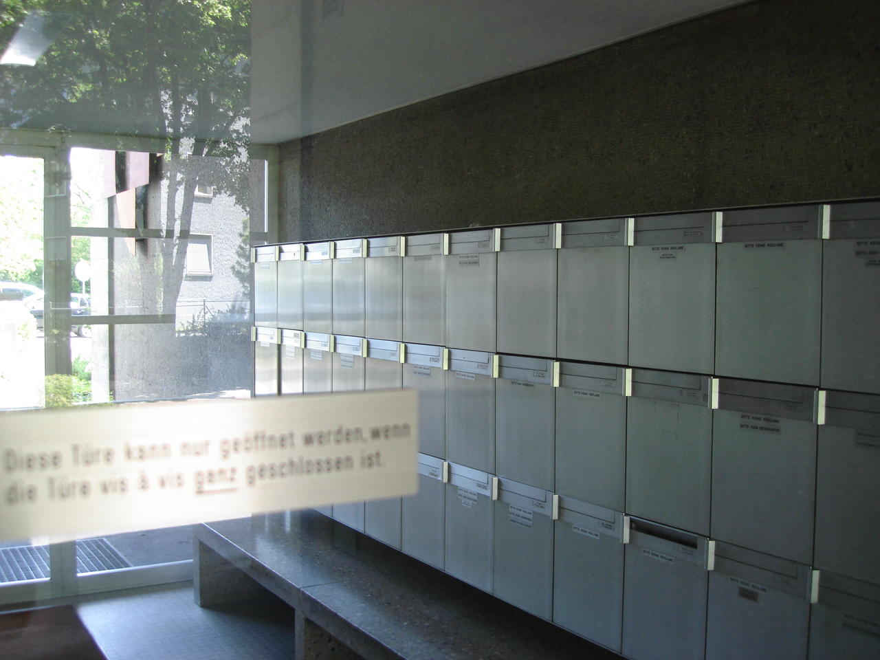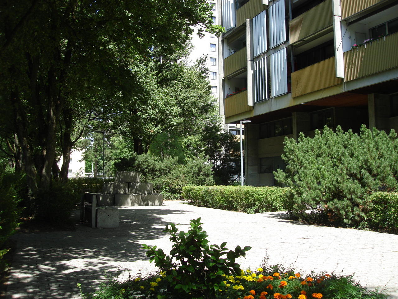Тот же самый принцип: прозрачные двери, домофон, все просто, но очень элегантно и не депрессивно. Теперь повернемся обратно. Уже знакомый нам подъезд блочной многоэтажки: красиво, уютно, разумно, никаких машин. Кстати, так где же все-таки жители этих домов паркуют свои машины?