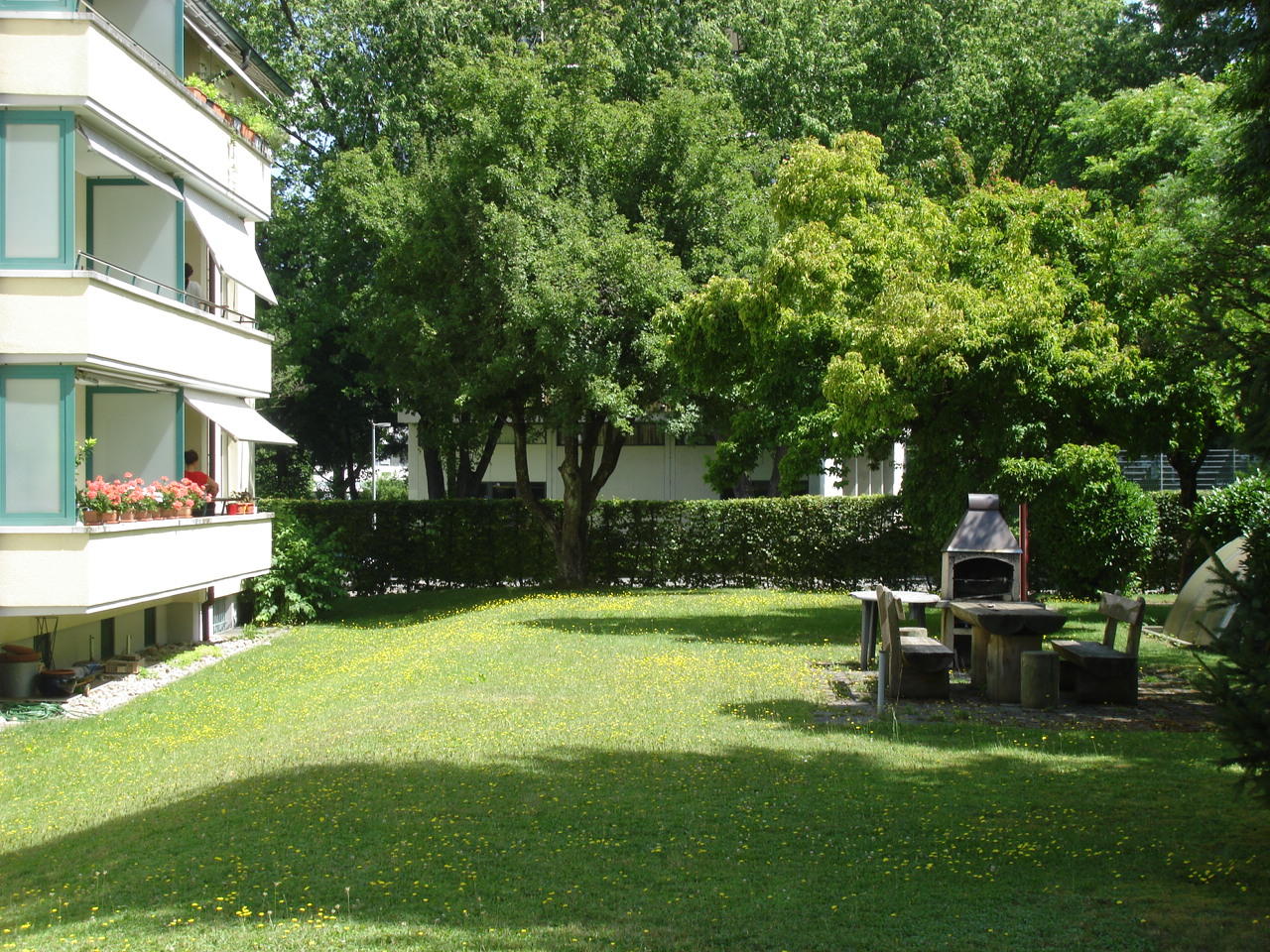 Там, где так и хочется устроить парковку, разбит газон и сделано все, чтобы комфортно грилить с друзьями по выходным. А теперь подходим к обычному многоэтажному блочному дому. На что хотелось бы обратить тут внимание? На заднем плане справа виднеется крыша старинного крестьянского дома, которому точно лет сто, не меньше.