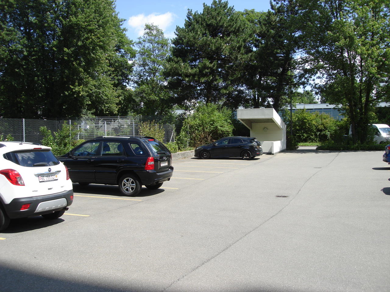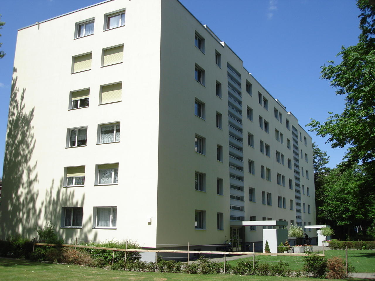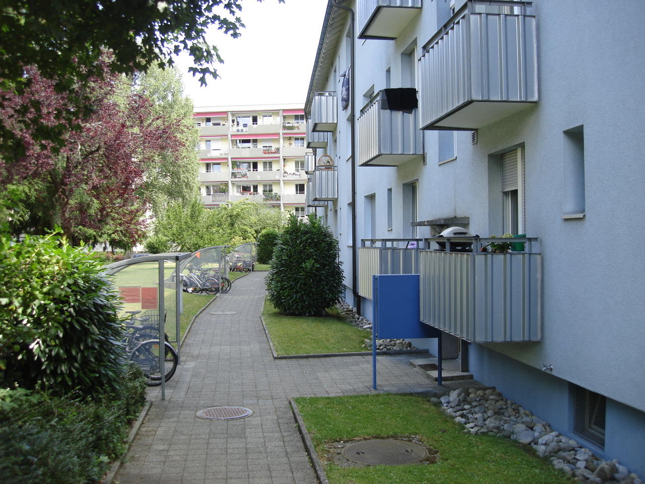 Отмечаем, что разметка сделана желтым цветом. О том, чем в Швейцарии отличается «желтая парковочная зона» от «синей» и «белой» зон можно прочитать в этом материале в разделе «Транспорт». А теперь развернемся на 180 градусов и посмотрим вот на эту шестиэтажку.