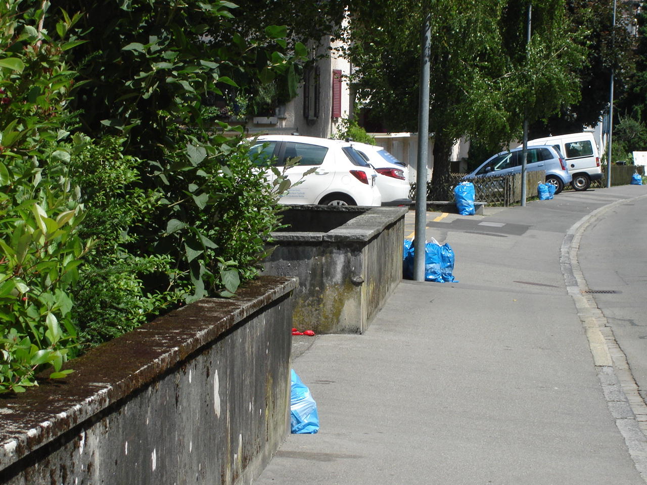 Так здесь утилизируются обычные твердые бытовые отходы: они просто выставляется в специальных мешках объемом в 35 литров на обочину (о макулатуре, биоотходах и крупном мусоре речь сейчас не идет). Потом приезжает машина и специально обученные городские служащие забирают мешки. Приобретать их нужно по цене 17 франков / 980 рублей за 10 мешков по 35 литров в крупных магазинах. Ни в одном другом мешке мусор просто не возьмут. И будет стыдно! А так выглядят старые гаражи.