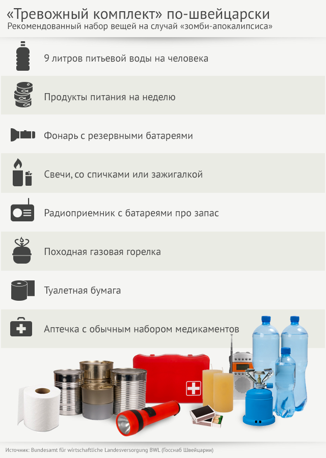 По результатам проведенного в прошлом году федеральными властями опроса стало ясно, что такого рода запасами обладает только одна треть домохозяйств страны. Швейцарцы, как видно, не могут себе представить ситуации, с которой сталкивались все люди на постсоветском пространстве, особенно в конце 1980-х, когда в магазинах шаром покати, а за пакетом молока нужно четыре часа стоять в очереди. А зря, между прочим! Готовым нужно быть ко всему.