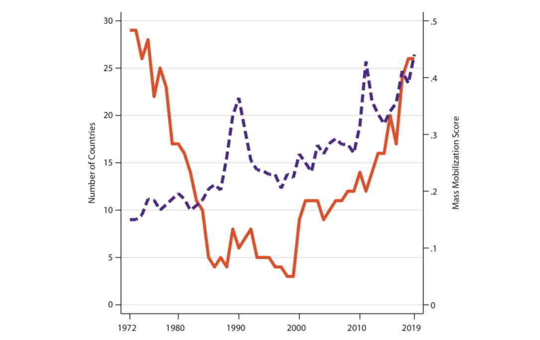 На графике показана глобальная тенденция к автократизации политических режимов (красный цвет) и глобальная тенденция к мобилизации масс в поддержку демократии (синий цвет):