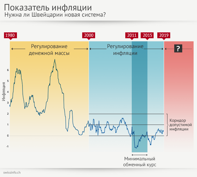 Сегодня всем ясно, что новая цезура схожего масштаба и значения стала неизбежной. Смена системы является необходимым шагом. Однако при всем желании я не способен разглядеть какие-то меры, которые предпринимал бы ЦБ Швейцарии в плане подготовки такого рода реформы. А заплатим мы за эту беспечность тогда, когда нам на голову свалится очередной кризис. Однако не будем забегать вперёд! Для начала уточним, что начиная с 2000 года швейцарский ЦБ реализует свою денежно-кредитную политику при помощи рычажка, который меняет ставку рефинансирования, то есть стоимость кредитов. При этом мерой всех вещей выступает инфляция.