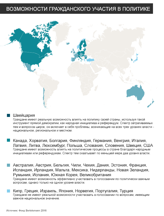 Итак, подводя итоги, можно сказать, что исследование Фонда Бертельсман по теме народных политических прав стоит рассматривать в качестве первой независимой попытки провести рейтинговый анализ потенциалов демократических систем ведущих стран мира с особым акцентом на роль инструментов, позволяющих гражданам непосредственно принимать участие в политическом процессе. И здесь, как говорится, нет предела совершенству – это касается как реальных демократий, так и данного рейтинга немецких аналитиков. Им всем есть еще куда развиваться!