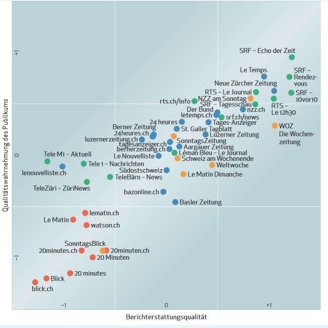 На графике ниже можно представить себе общую ситуацию на рынке СМИ в Швейцарии. По вертикали: субъективное восприятие качества, по горизонтали: объективное качество СМИ.