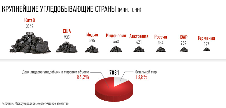 Из них почти половина (3,5 млрд. тонн) добывается в Китае, где, в прочем, большая его часть и расходуется. Для сравнения: месторождения в Южной Африке дают в год около 260 миллионов тонн угля, около четверти из которых идет на экспорт. В Южной Африке благодаря углю покрывается примерно три четверти потребности в энергии.
